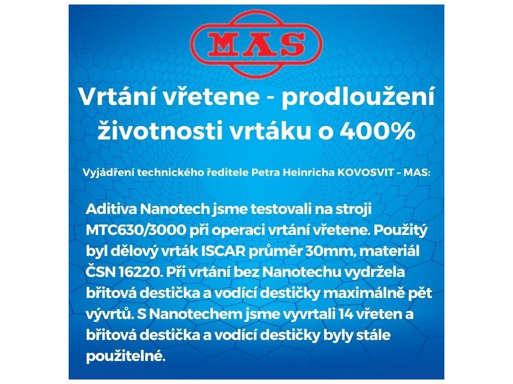 Tieto informácie dopĺňa operátor pán Vladislav Melichar. Tak sme už vyvŕtali ďalších päť vretien a doštičky sú stále funkčné. Na stroji vŕtame až do priemeru 100mm a hĺbky 1m, sústružíme a frézujeme. Pri všetkých operáciách je zreteľné, že nástroje s Nanotechom vydržia preukázateľne dlhšiu dobu ako bez Nanotechu. Tiež je zrejmé, že s Nanotechom je nižšia hlučnosť, lepšie opracovanie a plátky sa vplyvom zníženého trenia neprehrievajú – nefarbia sa do fialova. Príjemné je tiež to, že sme vďaka Nanotechu znížili koncentráciu nami používanej emulzie až o 50% a tým sú výrobky a stroj menej lepkavý.