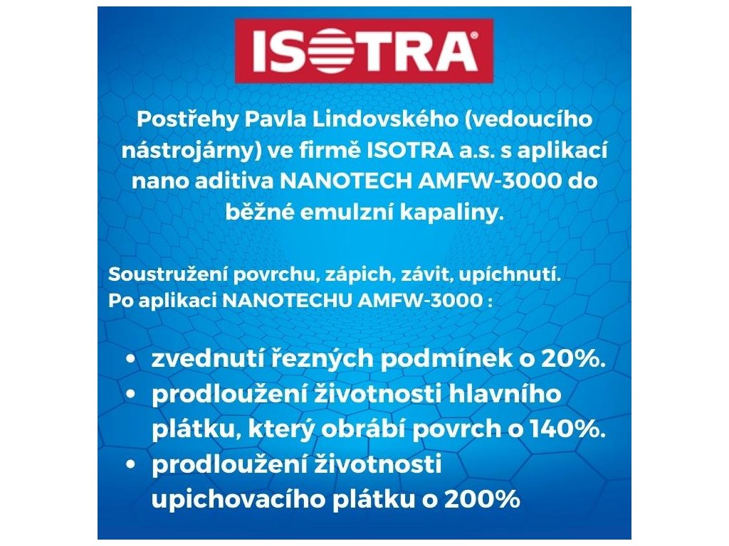 Postrehy Pavla Lindovského (vedúceho nástrojárne) vo firme ISOTRA a.s. s aplikáciou nano aditíva NANOTECH AMFW-3000 do bežnej emulznej kvapaliny.